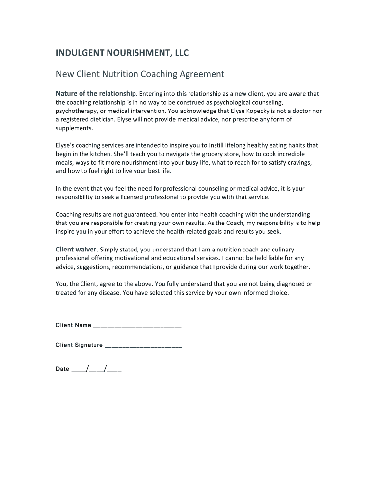 Careful consideration of the legal and ethical implications inherent in nutrition counseling underscores the importance of a well-drafted agreement. Such a document, outlining the terms of service, responsibilities of both parties, and potential risks, provides a crucial framework for a professional and legally sound relationship. Key elements like disclaimers of guarantees, assumption of risk clauses, and clear payment policies protect both the counselor and the client. This proactive approach facilitates transparent communication, manages expectations, and mitigates potential conflicts, ultimately contributing to a more positive and productive counseling experience.